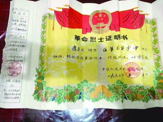 陈碧秋还记得,“父亲”去广西后,她只能在县政府工作人员上门送喜报和家书时,才知道“父亲”的近况。1966年1月,陈碧秋家中来了一群人,他们敲锣打鼓地送来了“父亲”被评为“五好战士”的喜报,以及一枚奖章。然而,1个月后,县政府工作人员再次上门,带来的却是“父亲”牺牲的消息。“听爷爷奶奶说他是在守仓库时牺牲的。”说到这时,电话那头的陈碧秋忍不住情绪激动起来。