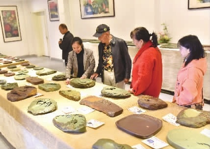 12月5日,双峰县杏子铺镇双源村,双峰县国藩溪砚展示交流中心,游客在选购溪砚。近年,该县传承发展省级非物质文化遗产溪砚制作工艺,依托水府庙水库库区旅游资源,推进文化旅游产业融合发展,助力乡村振兴。