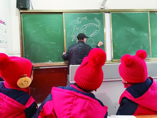“先画个圆圈,猫的眼睛晚上会发光,它有几根胡须……”杨新志从大家熟悉的动物着手,一笔一划引导大家作画,台下的同学们学得很认真,跟着在纸上画起来。不一会儿,活脱脱的一只猫便活跃在黑板和白纸上。
