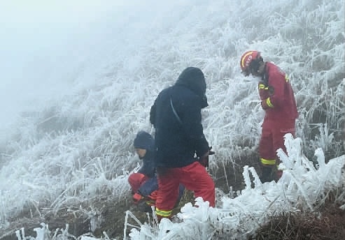凌晨2点左右,第一批18人救援人员开始登山。摸索、呼喊、搜寻……救援人员翻过一座山、两座山,在漆黑的崇山密林里趟路穿行。“当时一直下着雨雪,估计有零下3度,天又黑,根本看不清方向。晚上又结冰,地面上相当滑,很不好走。”参与救援的茶陵县紫阳街消防救援站指导员禹春风回忆说,他们不断接近被困“驴友”发出求救信号位置,但抵达临近地点以后才发现,由于悬崖阻断,根本无法抵达被困“驴友”位置。