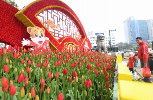 2月23日,长沙县开元中路星沙文化广场段,市民在欣赏路边花坛内盛开的郁金香。长沙县绿化管理部门探索尝试,将郁金香引入街头绿地的花卉布置中,市民在长沙县通程广场、生态公园、特立公园、三一路口等多地,都可看到盛开的郁金香。