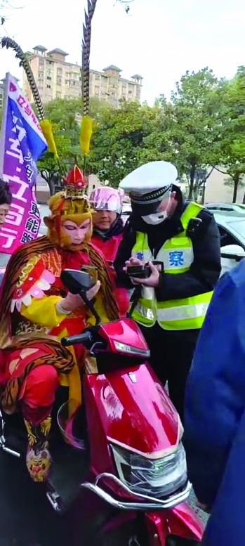 3月1日,常德公安交警直属二大队二中队民警在常德市城区战备桥路口开展“两车”整治行动时,忽然看到一位“齐天大圣”迎面而来。身穿金甲圣衣,头戴凤翅紫金冠,骑着一辆小电驴,但是没有戴安全头盔。