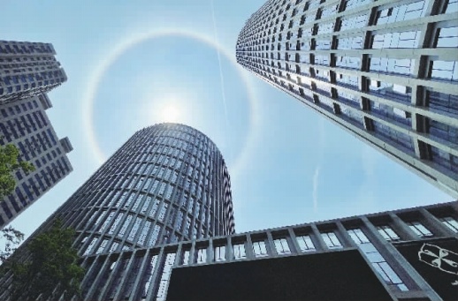 4月18日中午,长沙市天空出现日晕现象,一道内红外紫的光环环绕在太阳周围,仿佛是太阳“戴美瞳”。湖南省气候中心气候预测首席专家谢益军介绍,日晕是一种大气光学现象,日光通过卷层云时,受到冰晶的折射或反射而形成。民间有“日晕三更雨”的说法,出现日晕有一定的下雨概率,但并不意味着雨天必然到来。