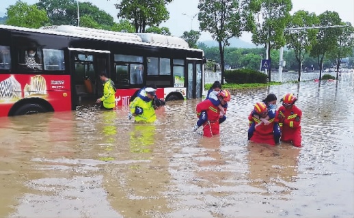 4月25日下午6时左右,长沙市岳麓区金星北路麦德龙超市附近一公交车涉水抛锚,车上10名乘客被困,有学生和老人。石岭塘消防救援站8名消防救援人员赶往现场,他们采用背或者抱的方式,经过20多分钟的接力救援,最终将10名乘客全部转移至安全地带。