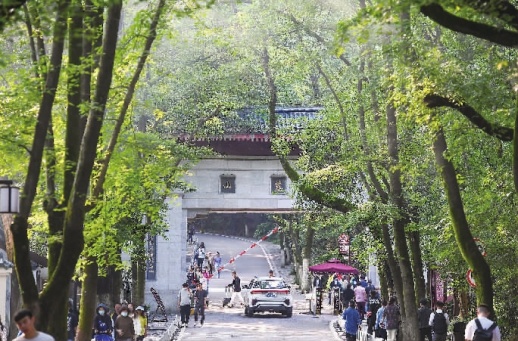 5月16日,市民从南门进入岳麓山景区。当天,长沙岳麓山南门恢复对外开放。上午10点,登高路上人来人往,路两旁的小吃店有的已经排起长龙,一些商铺也恢复了往昔的热闹。