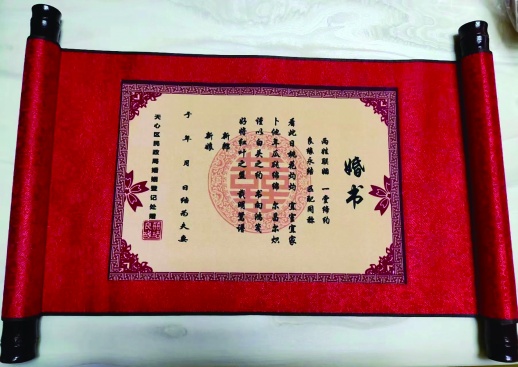 领证人数爆增,不少区县民政局为新人们准备了仪式感满满的浪漫祝福。为新人发放婚书,一直是天心区的传统。以前圆形的婚书已改成了方形,并整体装裱,如同“圣旨”一般,寓意婚姻的神圣。婚书上,这样写道:两姓联姻,一堂缔约,良缘永结,匹配同称。看此日桃花灼灼,宜室宜家;卜他年绵绵瓜瓞,尔昌尔炽。谨以白头之约,书向鸿笺,好将红叶之盟,载明鸳谱。