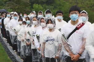 师生们一个个轮流上前献花、鞠躬,以表敬意。