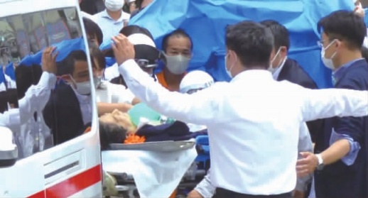 安倍被直升飞机运往附近医院。安倍在两声枪声后当场倒地。“安倍受到的枪伤触及心脏。”日本奈良医科大学医院的医生事后披露:“他胸部中枪,击中心脏,此外颈部也发现枪伤。”当地时间11时40分左右,救护车到达。有4至5名急救人员到场,采取了心肺复苏措施,当时周围覆盖了蓝布。他被送往医院时使用了AED。送医时,安倍处于昏迷状态,疑似心肺停止。