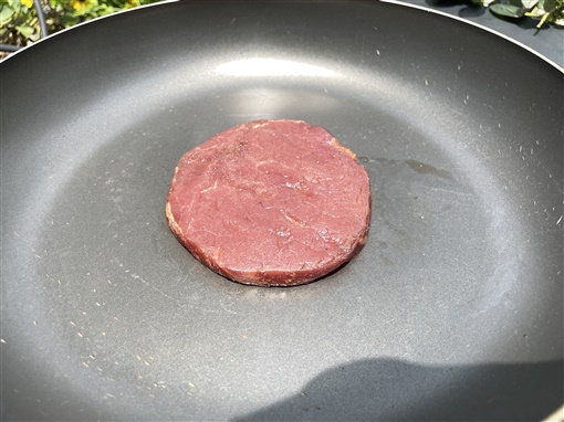 13时,记者将提前解冻好的牛排放入已在阳光下“预热”半小时的平底锅内,此时锅底已有些许烫手。13时30分,阳光直射半小时后,牛排表面开始收紧,且不见血水,其接触锅底的一面隐隐发白。按照每半小时给牛排翻个面的频次,1个多小时后,牛排表面颜色肉眼可见转变为褐红色,凑近可以闻到香味。