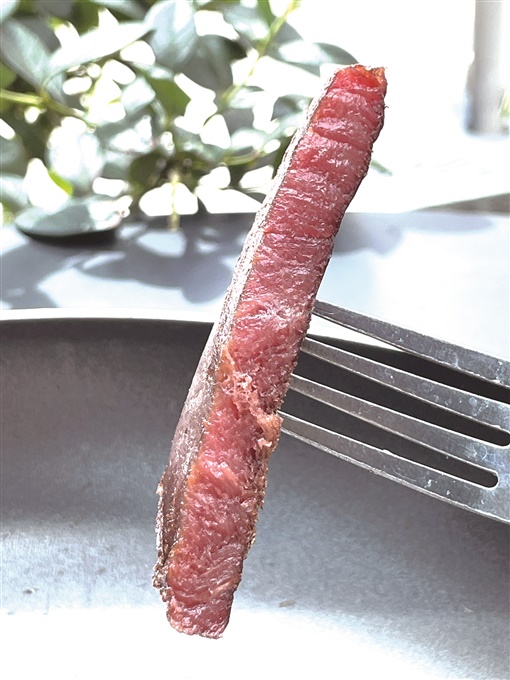 15时,牛排相比原始大小已经缩小一圈,表面触摸已无生肉的明显弹性。15时13分,三湘都市报记者将牛排切开,发现牛排内部已无血水,牛排呈现约七分熟的状态。不过,相比大厨烹饪的牛排,阳光“炙烤”牛排的表面水分缺失严重,如果食用,不仅不太卫生,而且口感可能不佳。