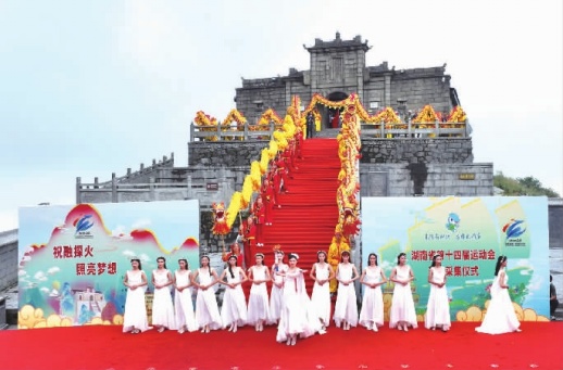 7月19日上午,湖南省第十四届运动会圣火采集仪式在南岳衡山最高峰——祝融峰举行。14名火炬手齐聚圣火采集仪式现场,以祝融圣火点燃运动之火。本届省运会将于9月8日在岳阳市举行。