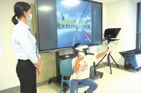 医生为程程戴上VR眼镜准备测试。VR眼镜便是试听整合连续测试系统(IVA-CPT),通过测试,为孩子们进行注意力、知觉能力、语言能力、计算能力、记忆力、体能力、定向能力等多维度筛查检测。通过VR智能系统,孩子们能在沉浸式的趣味内容中体验专注力提升训练。