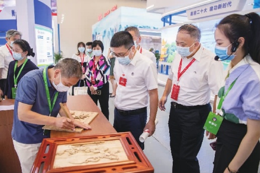 9月2日,首届大国工匠论坛在长沙举行。此次论坛以“匠心逐梦·强国有我”为主题,为大国工匠和工匠人才展现风采、分享经验、切磋技艺、提升素质搭建平台。图为论坛期间举办的首届湖湘劳模工匠创新成果展上,与会人员在参观木雕制作技艺。