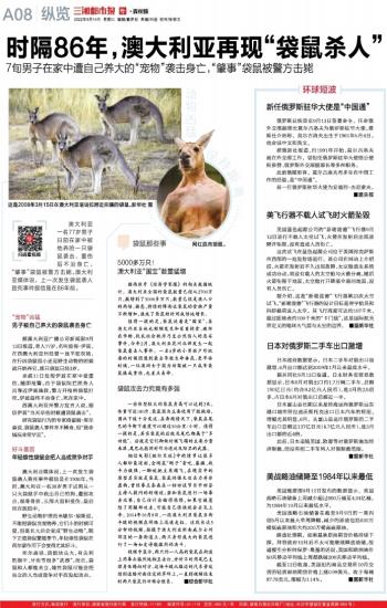 澳大利亚一名77岁男子日前在家中被他养的一只袋鼠袭击,重伤后不治身亡,“肇事”袋鼠被警方击毙。澳大利亚媒体说,上一次发生袋鼠袭人致死事件据信是在86年前。