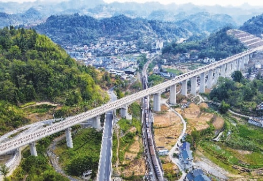 9月13日,吉首市双塘街道周家寨社区,动车组行驶在张吉怀高铁吉首跨焦柳铁路特大桥上,火车行驶在焦柳铁路上,一辆汽车行驶在乡村公路上,呈现一幅中国交通快速发展的立体图景。近年来,湘西州大力推进交通设施建设,特别是张吉怀高铁的开通,极大地改善了当地交通状况,助力当地经济社会发展。