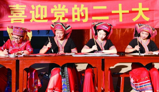 10月14日,江永县上江圩镇普美女书文化村,瑶族群众在用女书书写“喜迎二十大 奋进新征程”。当天,该村组织“红心永向党,喜迎二十大”主题学习,引导干部群众铭记党的光辉历程,厚植爱党爱国情怀。 田如瑞 摄