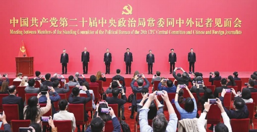10月23日,刚刚在中国共产党第二十届中央委员会第一次全体会议上当选的中共中央总书记习近平和中共中央政治局常委李强、赵乐际、王沪宁、蔡奇、丁薛祥、李希在北京人民大会堂同中外记者亲切见面。