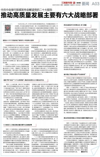 “党中央强调,贯彻新发展理念、推动高质量发展,是关系现代化建设全局的一场深刻变革,不再简单以生产总值增长率论英雄,而是要实现创新成为第一动力、协调成为内生特点、绿色成为普遍形态、开放成为必由之路、共享成为根本目的的高质量发展。”穆虹表示,因此,党的二十大报告把发展质量摆在更突出的位置,经济、社会、文化、生态等各方面都体现了高质量发展的要求。