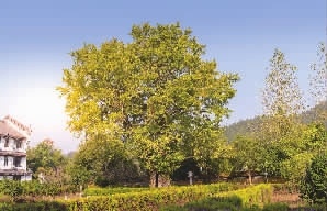 千载岁月悠悠而过,一树金黄一树诗。它在古寺的晨钟暮鼓中,历经沧桑。尽管树心完全镂空,树中还长有悬乳,却依旧挺拔,风姿不减,宁乡当地人称它为“裴休树”。多年前,树干上还长有一株黄檀树,又称“白果含檀”。