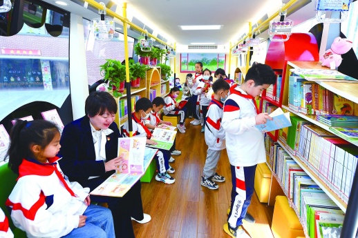 11月2日,长沙青园友谊小学校园,师生登上巴士智能图书馆。日前,该校受《窗边的小豆豆》这本故事书的启发,将一台废旧巴士改造成智能图书馆,师生们可以通过智能“刷脸”在车上借阅各类书刊。这个温馨又充满童趣的车厢很快就成了孩子们的最爱。