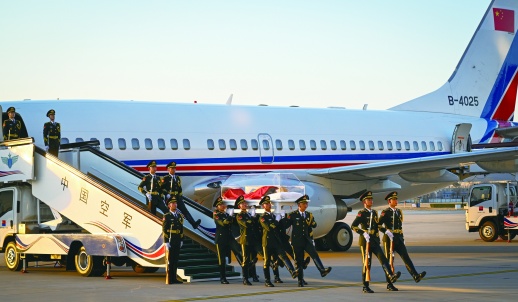 15时55分,载护江泽民同志遗体的专机缓缓降落。在低回的哀乐声中,12名礼兵抬护安放着江泽民同志遗体的灵柩,缓缓走下专机,行进至迎灵队伍正前方肃立。习近平等向江泽民同志遗体三鞠躬,目送灵柩上灵车。之后,治丧委员会办公室成员和江泽民同志亲属护送遗体前往停灵处。