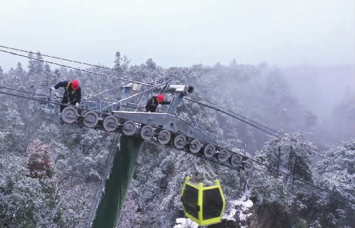 1月2日,张家界武陵源景区杨家界索道工作人员在索道支架上进行巡检。元旦假期,该景区出现低温冰雪天气,当地旅游管理部门对景区内高空客运索道进行安全隐患排查,保障冰雪天气下游览接待安全。