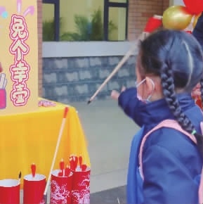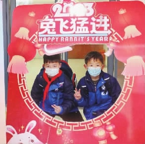 早上8时,长沙市实验小学校门口,一个个装扮可爱的“国潮小萌兔”蹦蹦跳跳进入校园。校门口前坪的舞狮表演吸引了师生的驻足,一红一黄两头狮子上下翻跃,不停舞动,欢呼声此起彼伏。“祝老师新年快乐”“希望老师新的一年大展宏兔、兔飞猛进、万事如意”……孩子们进教室时都不忘给老师拜大年,老师则送上新年愿望笺和礼物,让孩子们感受传统民俗文化魅力。