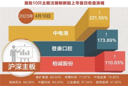4月10日,首批10只主板注册制新股上市,标志着股票发行注册制在A股全面落地。10只主板注册制新股的“首秀”颇为亮眼,无一破发,全线大涨,其中有三只新股股价涨幅超过100%,中电港的涨幅更是高达221.55%。