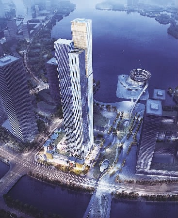 4月23日,位于湖南湘江新区梅溪湖畔的第一高楼——金茂梅溪大厦塔楼核心筒正式封顶。金茂梅溪大厦超高层项目总建筑面积21万平方米,由一栋318米高的超甲级写字楼,和4层23米高的商业裙楼组成。目前该项目建设高度突破298.8米,已完成塔楼主体结构的90%。(见左图,右图为建设效果图)