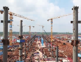 由围挡大门而入,来到由湖南建投建工集团承建的C指廊区域,看到作业人员正在进行钢筋绑扎和混凝土结构施工。