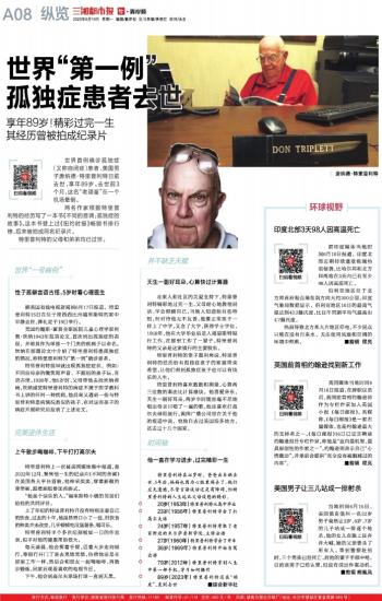 世界首例确诊孤独症(又称自闭症)患者、美国男子唐纳德·特里普利特日前去世,享年89岁。去世前3个月,这名“老顽童”在一个机场晕倒。