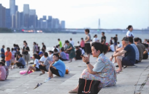 7月7日傍晚,长沙市湘江中路风帆广场段,市民在江边游玩。小暑节气,当地众多市民来到江边,享受徐徐江风带来的凉意。