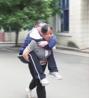 进入高中后,陈建明决定专心陪读。学校给母子俩提供了一间宿舍,并给她安排一份保洁工作,身材瘦小的陈建明除了打扫卫生,还要每天背着儿子在教室宿舍间往返五六趟。