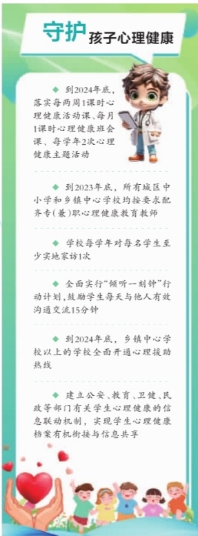 到2024年底,建设集管理、服务、培训功能为一体的心理健康管理系统,建立公安、教育、卫健、民政等部门有关学生心理健康的信息联动机制,实现学生心理健康档案有机衔接与信息共享。