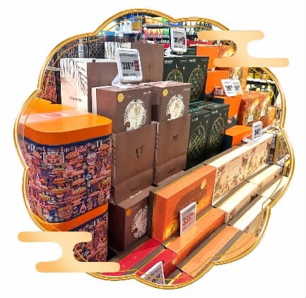 在富兴时代广场罗森尼娜店,月饼礼盒在展示台堆成了山,铁皮盒和牛皮纸盒是主要外包装材质。
