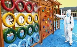 秋季新学期即将开启,各地都在精心准备,重点部署,迎接同学们的到来……①8月29日,永州市江永县中心幼儿园,教工对活动器材进行清洁消毒;②8月28日,衡阳市高新区二塘小学,老师在整理课本。③8月29日,新田县金达来校车公司校车集中停放处,交警在对校车进行安全检查。