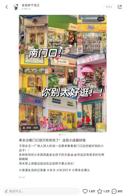 今年5月,卢晓在社交平台上翻看同类博主的笔记时发现,虽有博主写长沙City Walk相关主题,可很少。“于是我开始写下第一篇,数据就来了。”在卢晓做的“City Walk合集”中,第一篇《南门口!你别太好逛!》就收获1.8万个赞、1.2万次收藏、近千条留言评论。