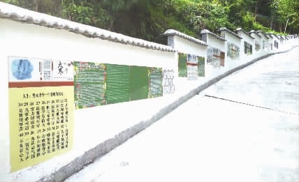 文化墙由104个版块构成,其中24个版块主要介绍24个节气及习俗,其余80个版块由爱国主义教育、家风家训家规、清正廉洁、环境卫生等内容组成。路基拓宽硬化、文化墙烤瓷就花费了5万多元。2022年6月,呈阶梯状的文化墙完工,成为大山里夺目的一道风景。