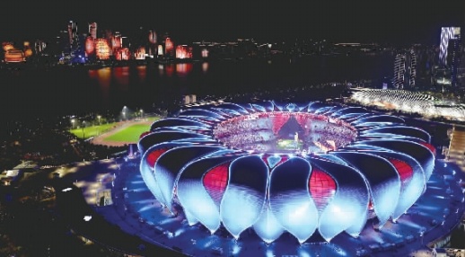钱塘江畔,夜幕下的杭州奥体中心体育场流光溢彩,宛如一朵美丽的“大莲花”。