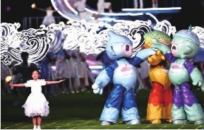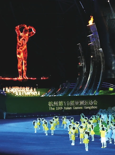 10月8日,杭州第19届亚运会闭幕式在杭州奥体中心体育场举行。闭幕式以一场惜别杭州与欢聚亚洲的嘉年华欢歌,传达“攀花赠友”的隽永情谊与“荷桂共生”的美好愿景。“数字火炬手”再次返场。随着主火炬缓缓熄灭,杭州亚运会圆满落下帷幕。①数字火炬手“弄潮儿”向现场观众“比心”。②吉祥物在闭幕式上表演。③演员在闭幕式上表演。
