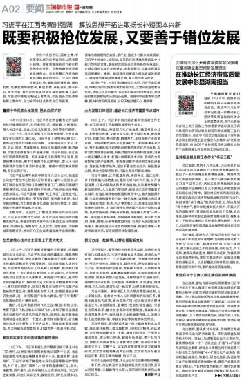 习近平指出,构建现代化产业体系,既要有雄心壮志,积极抢位发展,又要立足实际,善于错位发展。要找准定位、明确方向,整合资源、精准发力,加快传统产业改造升级,加快战略性新兴产业发展壮大,积极部署未来产业,努力构建体现江西特色和优势的现代化产业体系。有针对性地部署创新链,积极对接国家战略科技资源,突破一批关键核心技术,打造一批高新技术产业,形成在全国有影响力的产业集群。积极推进数字经济和实体经济融合,发展壮大数字经济。坚定不移走生态优先、绿色发展之路,推动全面绿色转型,打造生态文明建设高地。