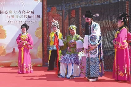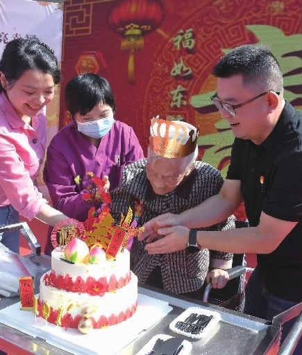 10月22日,长沙市天心区福利中心操场,青年志愿者与101岁老人李生玉共庆生日(上图)。花鼓戏演员正为老人表演节目《四郎探母》(下图)。当天,“同心聚力点亮幸福 百叟齐聚共庆重阳 ”敬老爱老活动在大托新村举行。百余名80岁以上老人、离退村干部欢聚一堂,品尝美食、欣赏戏剧、共话家常,义务体检,院内处处暖声笑语,洋溢着浓浓爱老敬老之情。