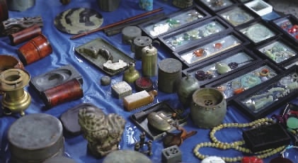 瓷器玉器、文房雅玩、竹木雕刻、文玩杂项、海外回流古玩艺术精品……参展商在入住的酒店客房中,以桌、椅、床、凳甚至地板为“展柜”,展示各类文物艺术品,大开房门欢迎八方来客。