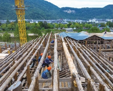 11月14日,张家界市武陵源区大夫第文博园项目建设现场,工人在忙碌施工。该项目是武陵源区高质量规划建设的“湘赣文旅合作示范”城市休闲文旅项目,以明清建筑为设计蓝本,打造成一个集度假酒店、文化博览、商业配套于一体的综合性文旅项目。