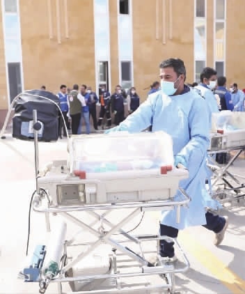 当地媒体的直播画面显示,埃方医护人员小心翼翼地把婴儿从救护车里抬出,放在移动保温箱中,然后将他们推过停车场,走向其他救护车。