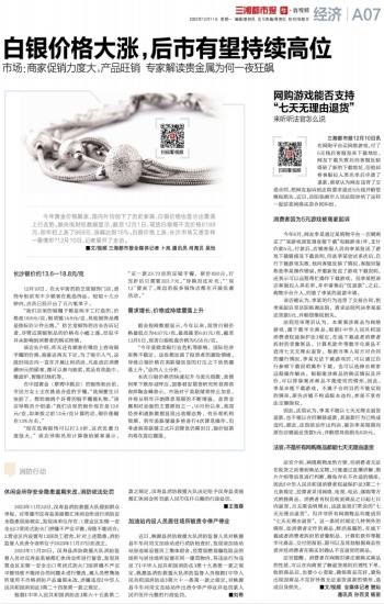 今年黄金价格飙涨,国内外均创下了历史新高,白银价格也显示出震荡上行走势。据央视财经数据显示,截至12月1日,现货白银每千克价格6188元,较年初上涨了869元,涨幅达到16%。白银价格上涨,长沙市场又是怎样一番情形?12月10日,记者展开了走访。