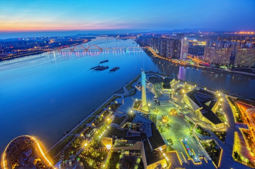1月4日,中央广播电视总台《2024年春节联欢晚会》分会场发布,湖南长沙、辽宁沈阳等四地将与北京主会场一起,将在除夕之夜为全球华人带来一台情意浓浓、热气腾腾的龙年春晚。据了解,春晚长沙分会场落子长沙滨江文化园。图为夜幕下的长沙“三馆一厅”,在灯光的映衬下,光彩夺目。湖南日报全媒体记者 唐俊 摄