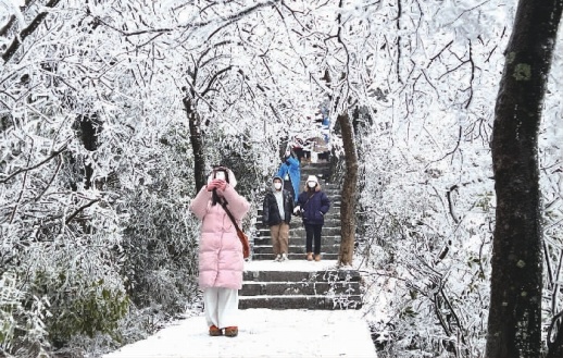 1月21日,海拔1500多米的张家界天门山迎来2024年首场降雪,大雪纷飞,漫山铺银,冰花盛开,皑皑白雪与山中林木绘就了一幅幅精美的冬日雪景图,吸引了众多游客赏雪观景,享受冰雪乐趣。