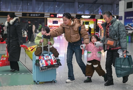 ▲1月26日,高铁长沙南站候车大厅,旅客携带行李乘车。