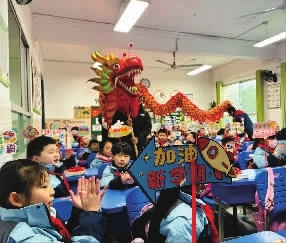 摸摸龙头,万事不愁;摸摸龙尾,顺风顺水……长沙市雨花区桂花树小学的孩子们没想到,居然有一条龙“飞”入教室,进班给孩子们送祝福。孩子们伸出小手,从龙头摸到龙尾,兴奋不已。